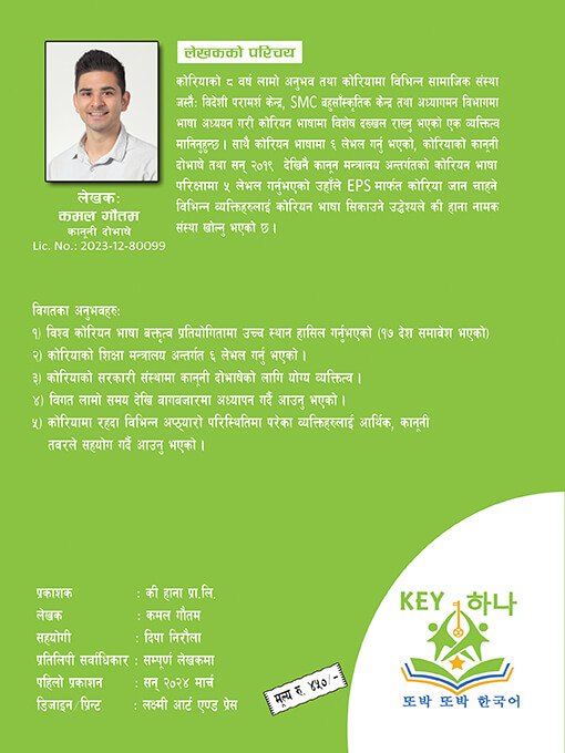कोरियाको ८ वर्ष लामो अनुभव तथा कोरियामा विभिन्न सामाजिक संस्था जस्तैः विदेशी परामर्श केन्द्र, SMC बहुसाँस्कृतिक केन्द्र तथा अध्यागमन विभागमा भाषा अध्ययन गरी कोरियन भाषामा विशेष दख्खल राख्नु भएको एक व्यक्तित्व मानिनुहुन्छ । साथै कोरियन भाषामा ६ लेभल गर्नु भएको, कोरियाको कानूनी दोभाषे तथा सन् २०१९ देखिनै कानून मन्त्रालय अन्तर्गतको कोरियन भाषा परिक्षामा ५ लेभल गर्नुभएको उहाँले EPS मार्फत कोरिया जान चाहने विभिन्न व्यक्तिहरुलाई कोरियन भाषा सिकाउने उद्धेश्यले की हाना नामक संस्था खोल्नु भएको छ |